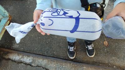 軍手を入れた長いビニル袋で遊びながら登校してきた1年生が自慢げです。