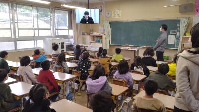 不審者を確保したあと教室で粕屋警察署の方からのお話を聞きます。