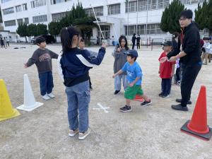 初めて長縄にチャレンジする1年生に跳ぶタイミングや方向を優しく教えてあげていました。