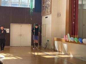 第2部では,バスケットボールのシュートや一輪車,ダンス,バイオリンやピアノの演奏,縄跳び,瞬間記憶,けん玉,バトンなどの特技を披露しました。