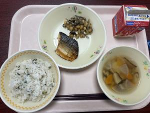 青菜ご飯・鯖の塩麹焼き・ぎすけ煮・すいとん・牛乳