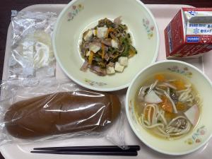 黒糖コッペパン・沖縄そば・ゴーヤチャンプル・冷凍パイナップル・牛乳