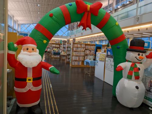図書館入口では、かわいいサンタとゆきだるまのクリスマスアーチがおでむかえ。