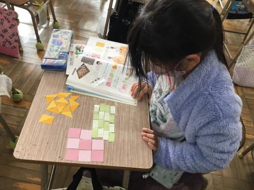 教科書に載っているのと同じ形を作るために、色板を右に左に動かして試行錯誤しています。このような「目、指」を同時に動かす活動の時に脳は活性化し、とても集中できているようです。