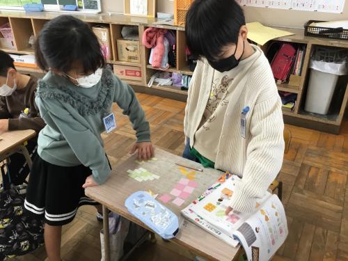 2年生の教室では、算数の学習で色板を使った活動が行われていました。きれいな色をした三角形、四角形を並べたりつないだりしています。