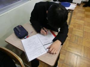 自学タイムの様子です。受験も近づいてきた3年生。授業中に集中して臨む生徒がほとんどです。この自学タイムでも、左ページの今日の振り返りが終わると、右側の自学ページに、黙々と問題を解いたり、まとめたりしています。とても落ち着いた、さすが3年生(受験生)といった雰囲気でした。