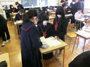 期末考査明けの今日、生徒の授業態度は特に変わらず授業に集中できている生徒がほとんどでした。1年生の総合的な学習の時間では、各自がつくった新聞(レポート)を基に、発表原稿をつくったり、質問事項を考えたりと、明日の授業参観で発表する準備を行っていました。生徒の頑張りをぜひ参観してください。