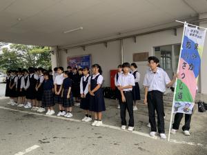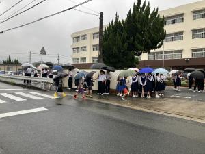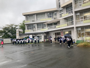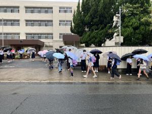 本日、第2回目の爽やかあいさつし隊を実施しました。小学生の元気な登校姿を見ることが出来て良かったと思います。しかし、本日は雨が降っており、傘をさしているため小学生の素敵な笑顔を見られず残念でした。今回の参加生徒は115名でした。