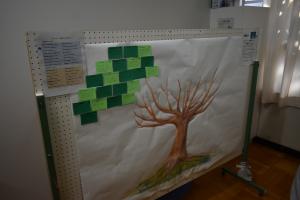 わかすぎ2組では、グリーンカードの制作に取り組んでいます。周りの友人のいいところを見つけて、木の形になるよう貼り付けていっています。