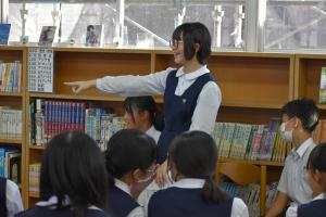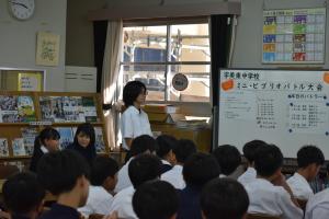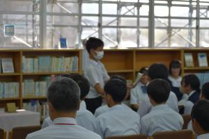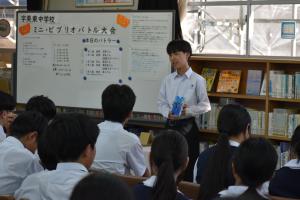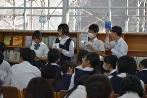10月10日金曜日の放課後に、図書委員会主催のミニビブリオバトルが図書館で開催されました。参加生徒、4名(3年生1名、2年生2名、1年生1名)のバトラーが、おすすめの本を紹介しました。お気に入りの本に出逢ったきっかけや印象に残った場面、あらすじなどをジェスチャーを交えて伝えていました。図書館には多くの生徒が集まり、図書委員を中心に進行などの運営を行い、読みたい本の投票を行いました。また、町立図書館館長をはじめ、3名の職員の方にも参観していただき投票まで行っていただきました。今回のチャンプ本は、3年3組 林田 清人 さんの「 浜村 渚の計算ノート 」です。本日バトラーによって紹介された本は、図書館の入り口に配置され、借りることができます。11月14日までが、読書週間です。この機会に、ぜひ、一度手に取って読んでほしいと思います。