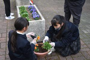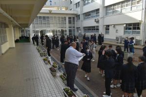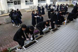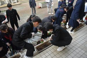 本日、16時から、卒業式に向けた「花植え」環境整備が行われました。参加された保護者・生徒会役員・ボランティア生徒の皆さんありがとうございました。今回は、プランターを使って花植を行いました。その花も今から根付き、卒業式には綺麗な花が見頃になっていると思います。