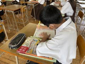 遠隔授業では,宇美中学校の美術科稲葉教諭の授業を宇美南中学校で受講するという,初めての取組となりました。1年2組の生徒たちも,慣れない授業の中,稲葉教諭の説明を一生懸命に聞き取ろうとする姿が見られました。
