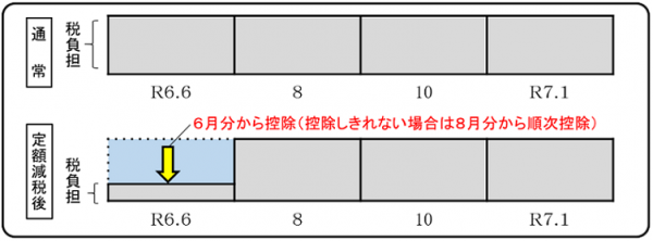 ※令和6年4月、6月、8月分の徴収税額は、仮特別徴収税額として令和5年6月時点で確定しているため、令和6年10月分からの減税となります。